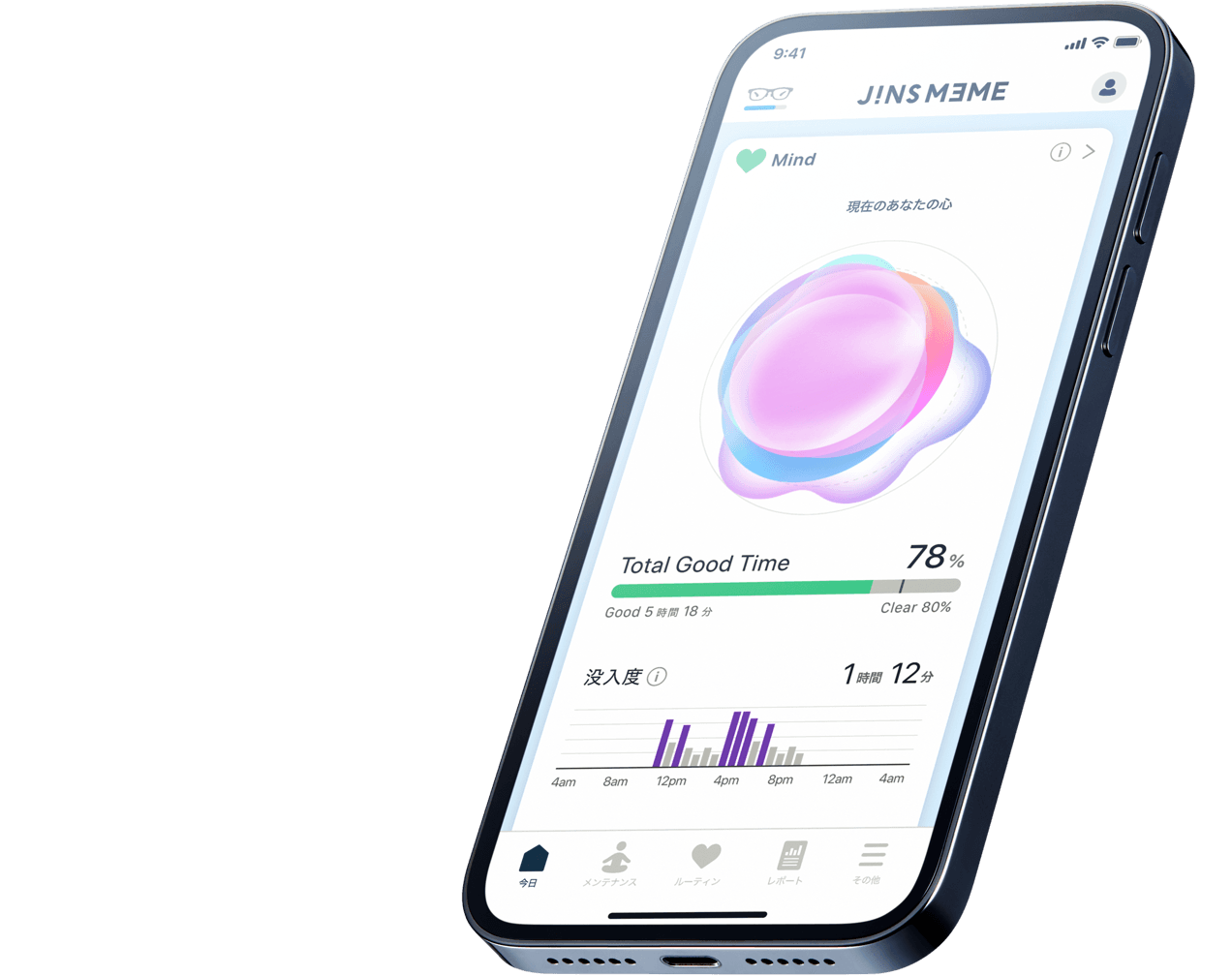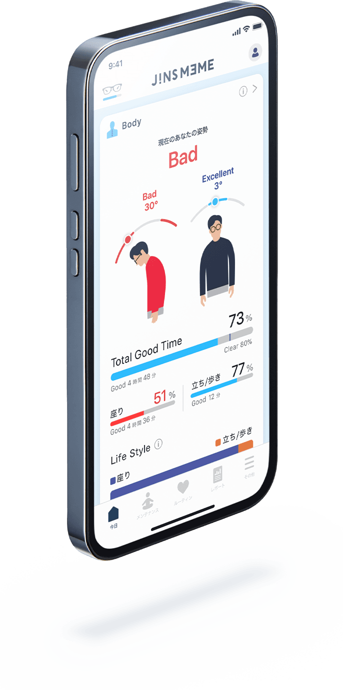 手元のスマホや、目の前のパソコン。私たちは人類史上、かつてないほど近い距離を見つめ続ける生活を送っています。その結果急速に広がったのが、姿勢の歪みからくる「スマホネック」や「テレワーク腰痛」。多くの人がカラダの凝りや痛みに苦しむ社会です。ヒトの見るものが変わり、悩みも変わった。ならばメガネの役割も、変わっていかねばなりません。「JINS MEME」は、肩こり、腰痛の原因となる悪い姿勢習慣を正すためのアイウェア。眼の健康だけでなく、カラダ全体の健康まで考える。新しい時代のプロダクトです。